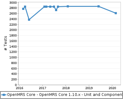 The chart below shows the number of tests across time. This provides a rough indication of the level of testing over time for the build.